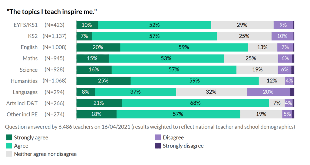 Finally, we asked how much the topics you get to teach inspire you. The most inspired groups are English, humanities and arts teachers. Surprisingly, language teachers are FAR less inspired by the topics they teach than any other subject group. What could we do to save them?!?