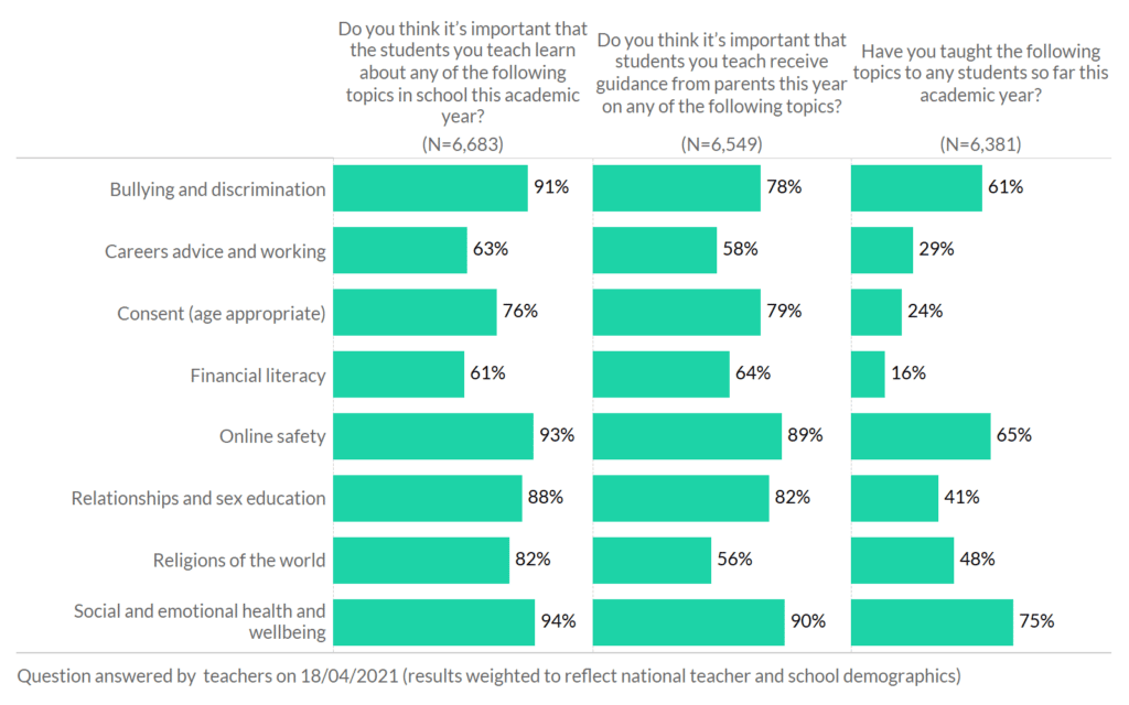 This week we asked you about teaching a number of topics where there has been a debate about the role of schools and the role of parents. Most of you do feel that it is important these topics are learnt in schools, but also that parents should educate their own children about them. The topics you are least sure that parents should be supporting are careers advice, financial literacy and religion. In the case of careers and financial literacy, it’s worth noting how few of you have taught these topics this year.