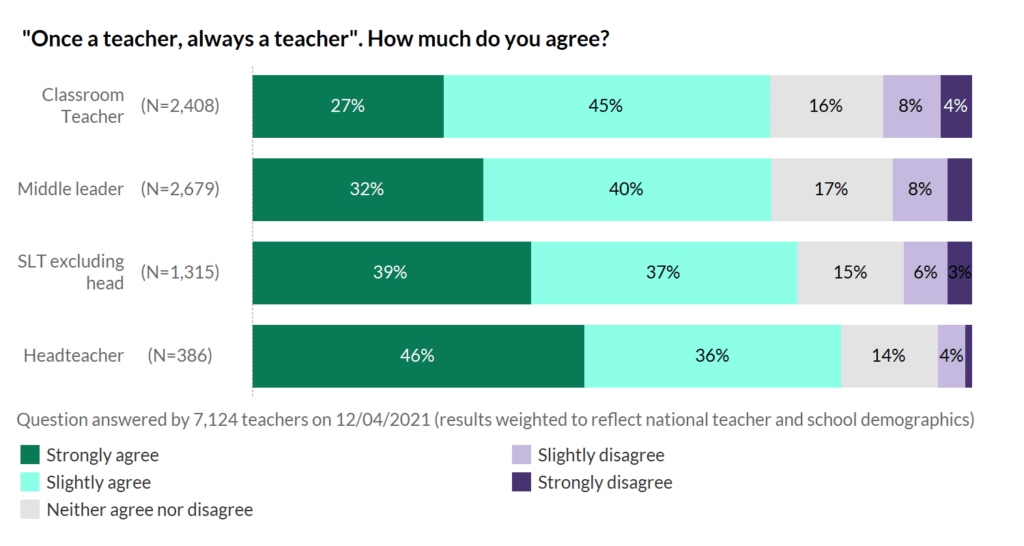 So, you’re a teacher. But will you always be a teacher, even if you don’t teach anymore? The extent to which you agree with the statement “Once a teacher, always a teacher” strongly relates to the kind of job you are doing at the moment. Headteachers are far more likely to agree this statement is true (and yet teachers in their 50s in general aren’t). Is this because of their own insecurities about whether they are personally still a teacher if they don’t currently have any classes to teach?