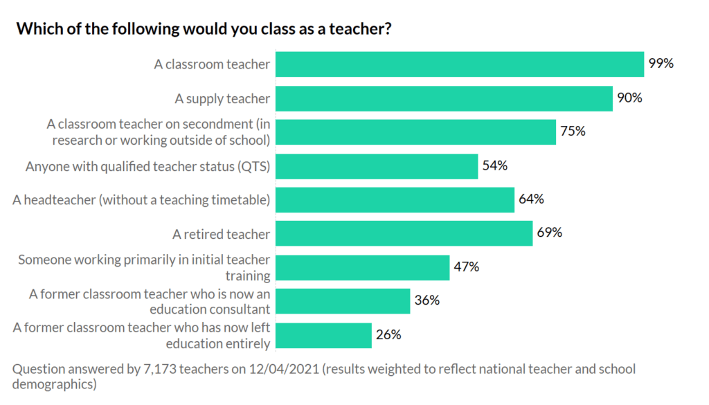 We asked you which of the following types of people you would classify as a teacher. Only two-thirds of you felt that a headteacher without a teaching timetable is still a teacher! And very few of you consider former teachers who are now education consultants or who have left education entirely to be one.