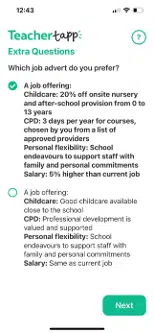Then you were shown two job adverts side-by-side — each with a different mix of salary, class size, workload, and flexibility — and asked which one you’d prefer.