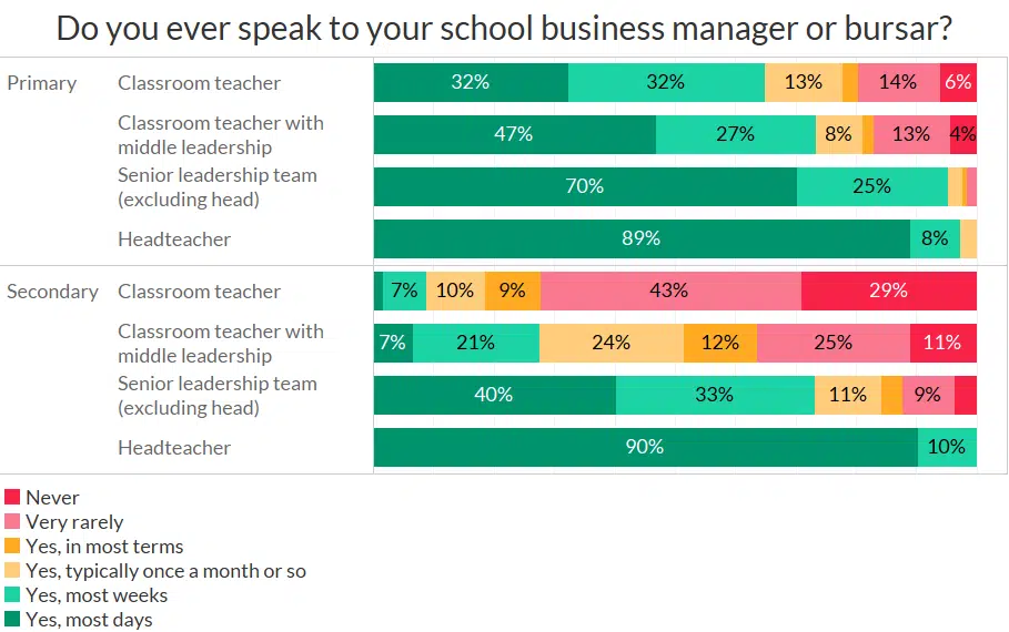 For secondary teachers this means the ability to access funding is likely constrained by a head of department (though around a third of these appear to have rare/no interactions with business managers).
