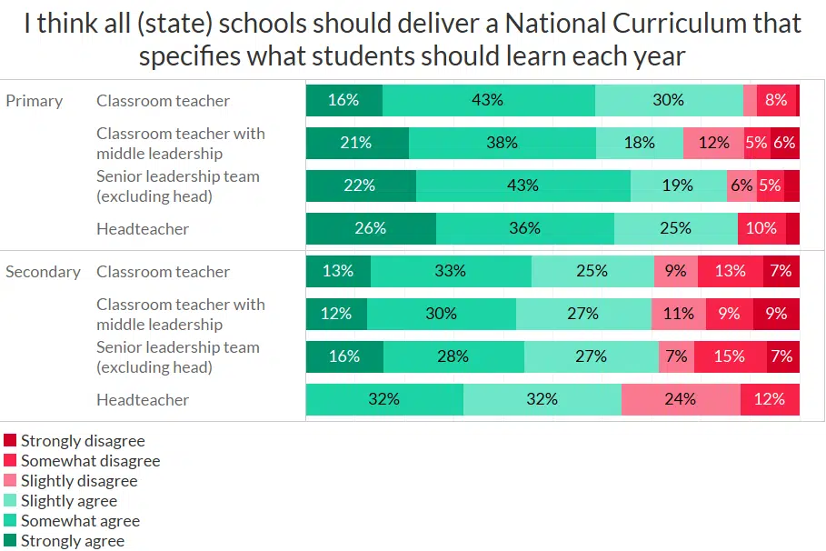 We found that 16% of teachers are ‘strongly’ in favour of a curriculum that specifies what should be learned each year, and 35% ‘somewhat’ agreed. Only a quarter of teachers disagreed with the idea.