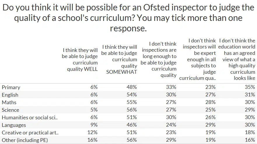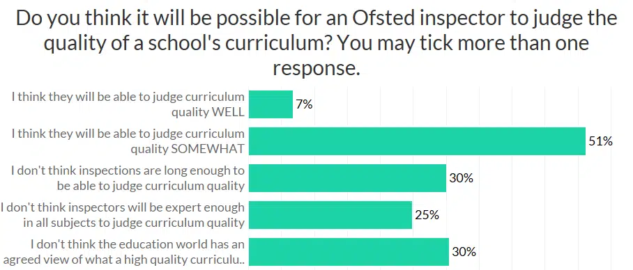 AND YET… when we asked if teachers thought it was possible to judge curriculum quality around a third of teachers had serious reservations and just 7% of teachers think Ofsted are WELL able to judge curriculum quality. Whaaat?!