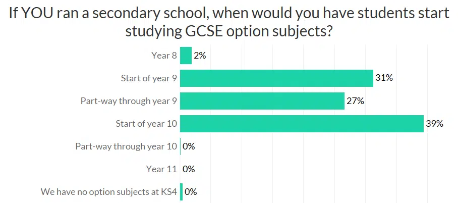 If given a free choice, 58% of teachers would start GCSE courses in Year 9 (either at the start or partway through)