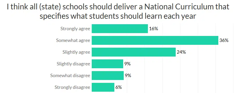 We found that 16% of teachers are ‘strongly’ in favour of a curriculum that specifies what should be learned each year, and 35% ‘somewhat’ agreed. Only a quarter of teachers disagreed with the idea.