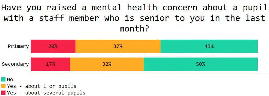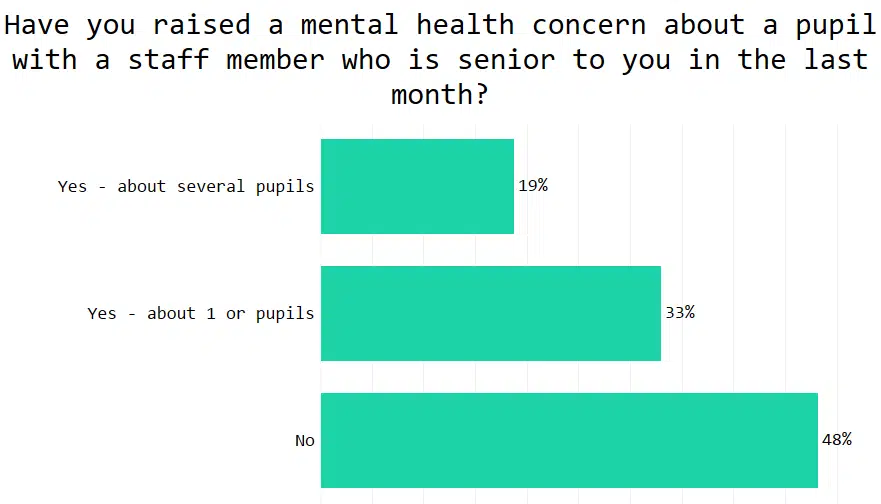 A simple question is to ask whether teachers have raised a mental health concern to a senior member of staff. We found half of teachers have raised at least one mental health issue about a pupil in the past month – and 19% raised more than 2.