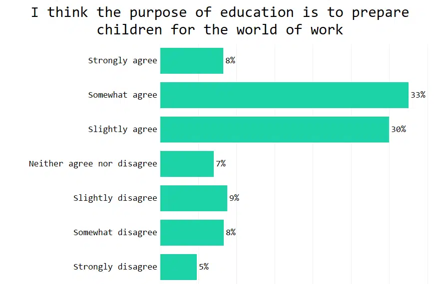 There is more agreement than disagreement to the world of work as a purpose. But notice again the lack of ‘strong’ agreement. Does this mean people feel it is only one purpose? Maybe not even the most important one? This is why we will triangulate with other questions. Keep an eye out for future results.