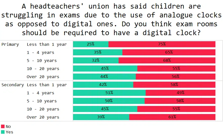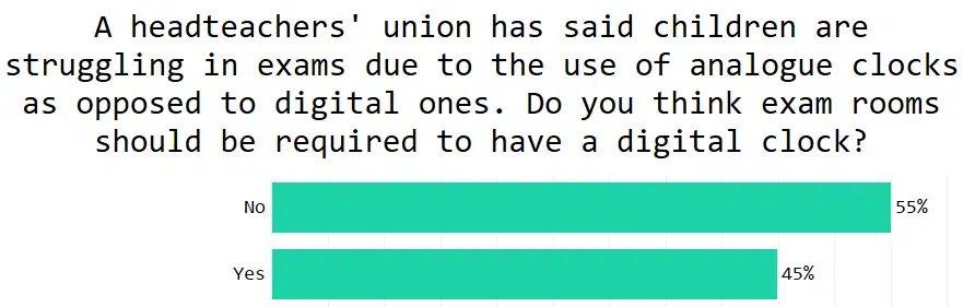 Clock-gate hit the headlines last week after a headteachers’ union said that children are struggling in exams due to the use of analogue over digital clocks. The idea prompted a bit of a furore, so we figured we’d use Teacher Tapp to see what teachers had to say (as opposed to angry people on radio phone-ins).