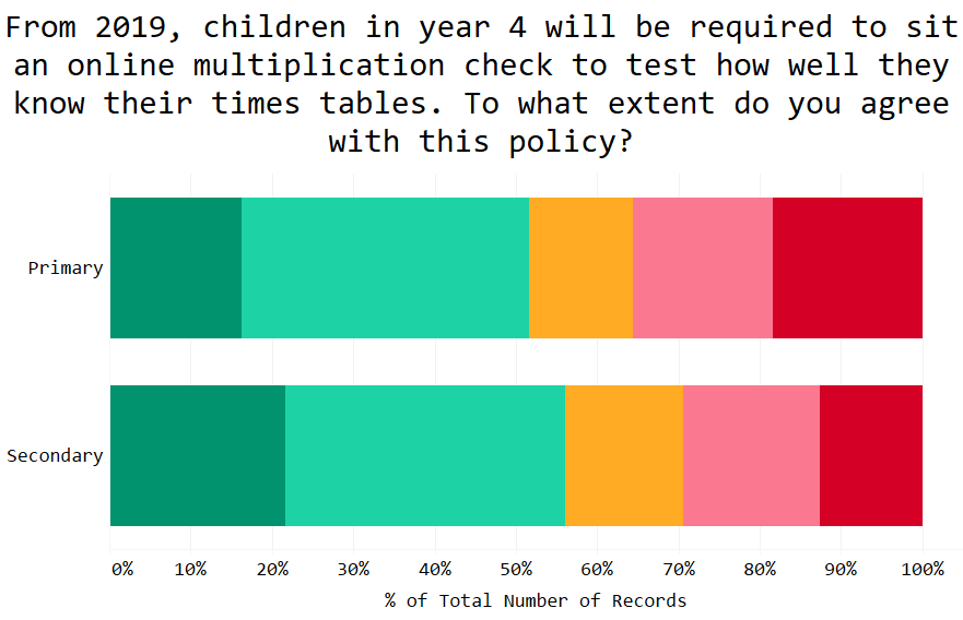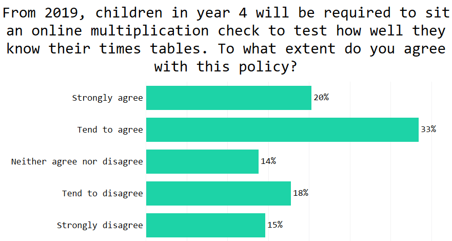 But we found teachers were more positive about the multiplication check than negative – with 53% agreeing, and only 33% disagreeing. (The rest were ambivalent).