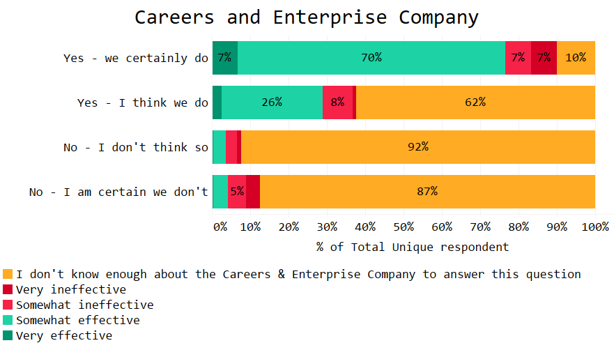 The yellow bars represent the many teachers who didn’t know enough about the Careers & Enterprise Company to make a judgement. More marketing needed, maybe?