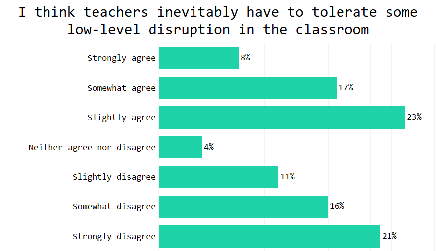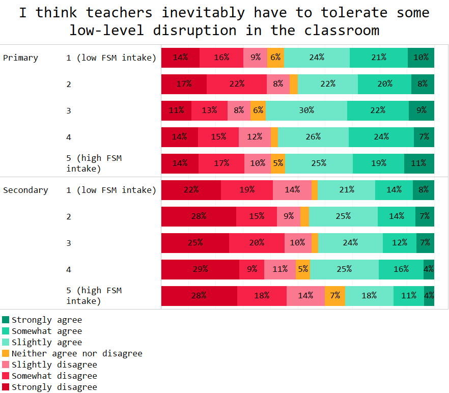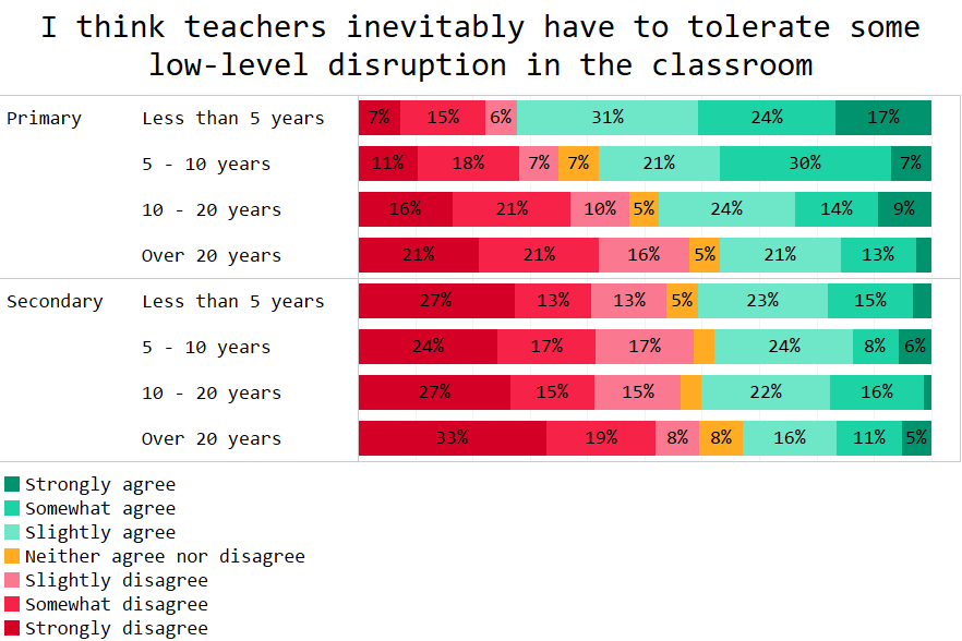 Secondary teachers were less likely to believe they must tolerate low-level disruption, even compared to the most ardent primary teachers. Secondary heads were the strictest of all.