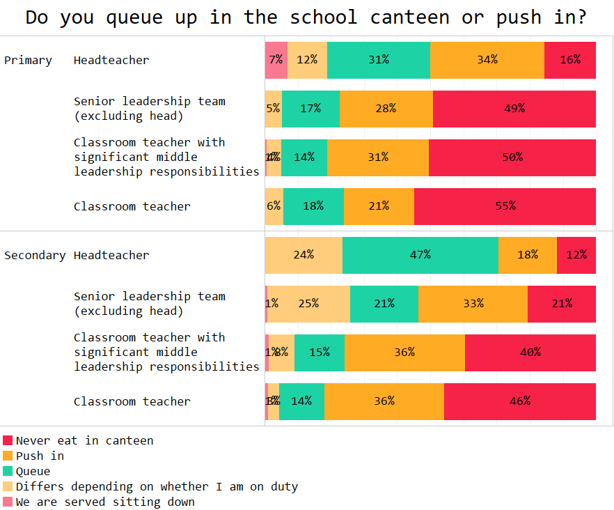 Actually, the data didn’t show too many differences between teachers in schools with lots of pupils on free meals versus those with hardly any. There was a slightly tougher edge among secondary teachers in the schools with the highest number of free meals pupils, but that was about it.
