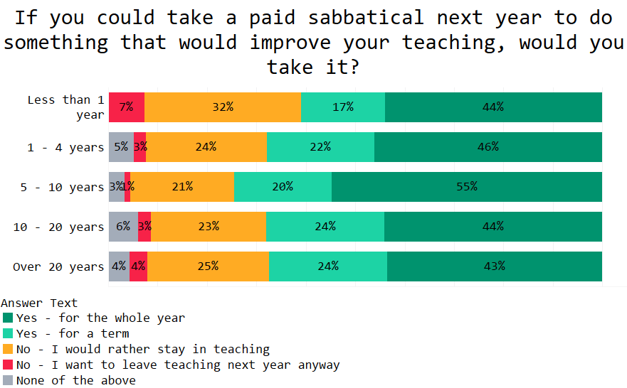 A worrying 44% of teachers in the 10-20 years of experience bracket said they would hop off for the whole year, and 24% said they’d go for a term.