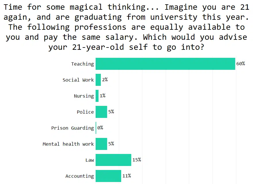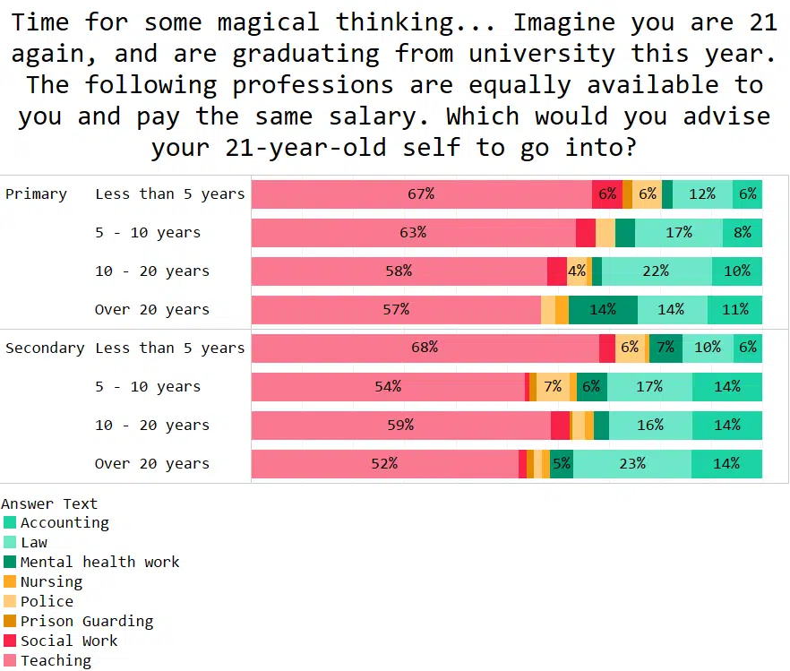 On the upside, the results show that most teachers would still advise their younger self to go into teaching. On the downside, the two professions that people think they would jump into – accounting and the law – are also desperate for graduates,particularly women, and are likely to start muscling in on the teaching profession over the next few years.