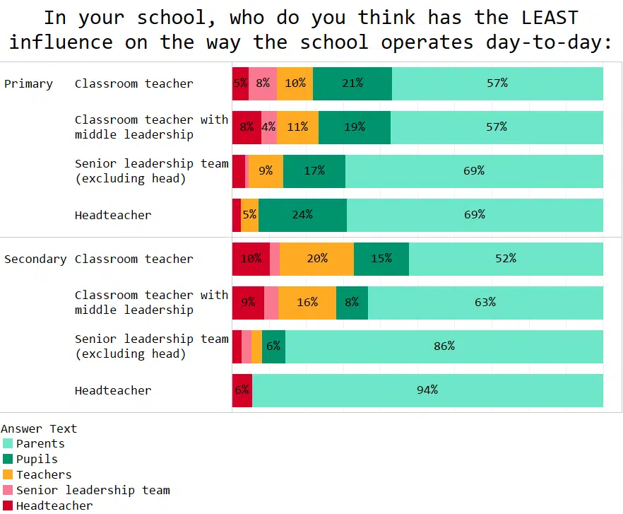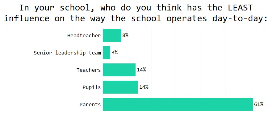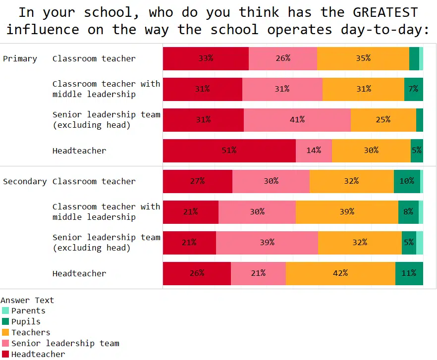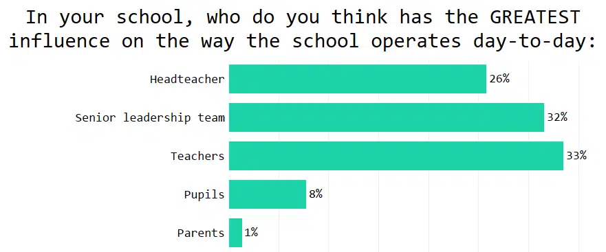 The results were fairly evenly split between the head, the senior leadership, and teachers as the biggest influence on the way schools operate: