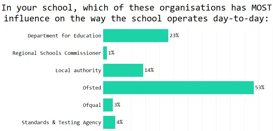 This balance changed in outstanding primary schools – where only 27% of teachers picked Ofsted. In their case, the Department for Education (40%) and the Standards and Testing Agency (12%) were more important.