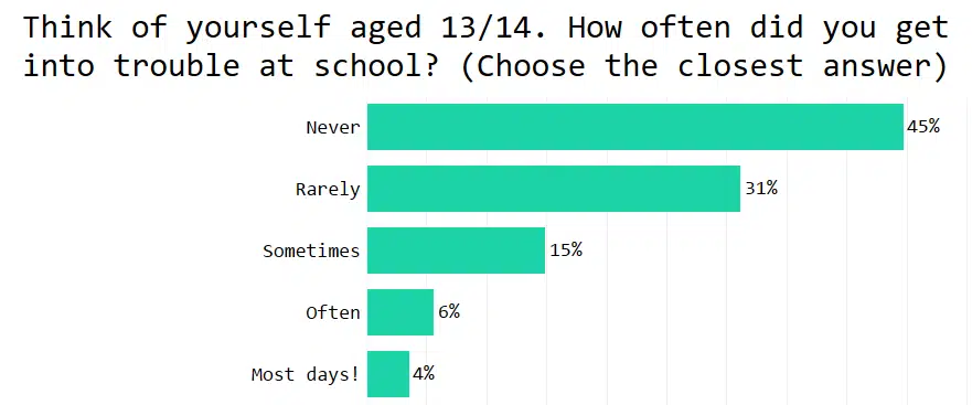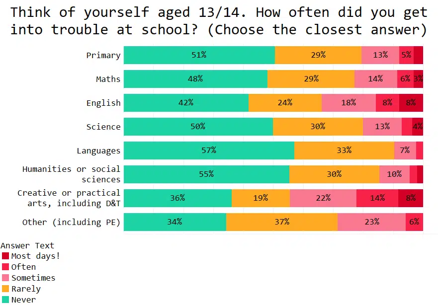 Unfortunately, that strategy doesn’t work so well for creative or practical arts teachers – half of whom said they were in trouble at least some of the time, and 8% said they were in trouble ‘most days’!