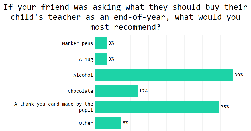 If you’re a bit uneasy sending your 8-year-old in with a six packet of Stella, then the second favoured gift was a thank you card made by the pupil. It might be better for the teacher’s liver, too!
