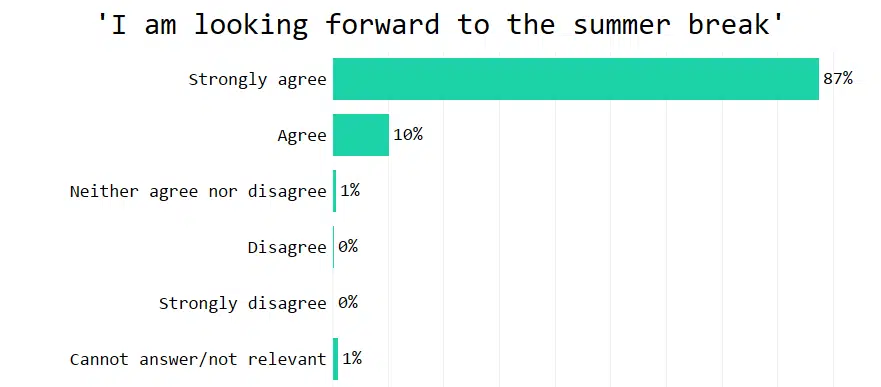 A whopping ZERO per cent of teachers disagreed with the statement ‘I am looking forward to the summer break’. That said, 1% of teachers neither agree nor disagree. As with pupils, one never knows what someone’s summer might have in store.