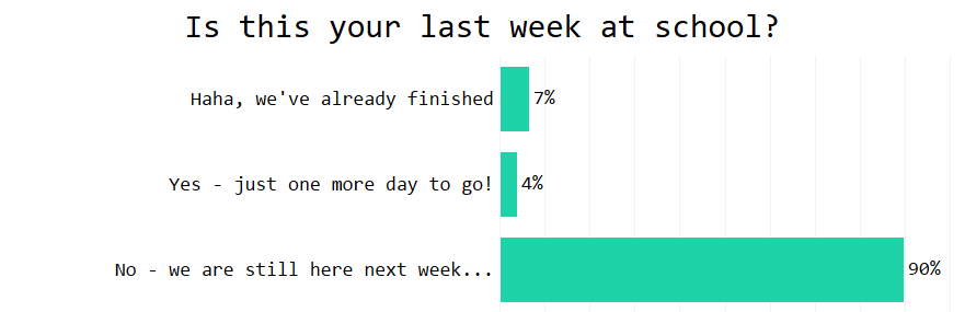 In a week or two almost everyone will be enjoying school holidays and we have no idea how this will affect Teacher Tapp. Will everyone tap frantically at 3.30pm because they’ve nothing else to do? Or will they be snoring on a beach/lake/sofa and be too chillaxed to care?