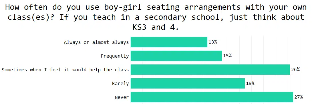 We found that 13% of teachers always, or almost always, sit children in a boy-girl arrangement. Just 27% never do.