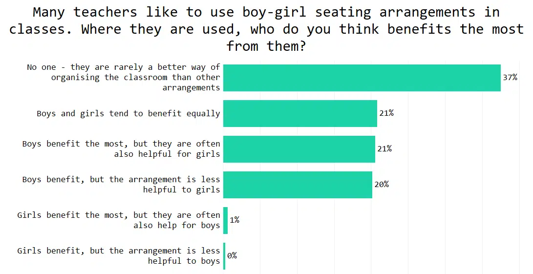 Why would people sit pupils like this? Of those who felt it helped, 21% felt boys and girls benefitted equally, while 41% said boys benefitted most. Only 1% of teachers felt it benefitted girls the most.
