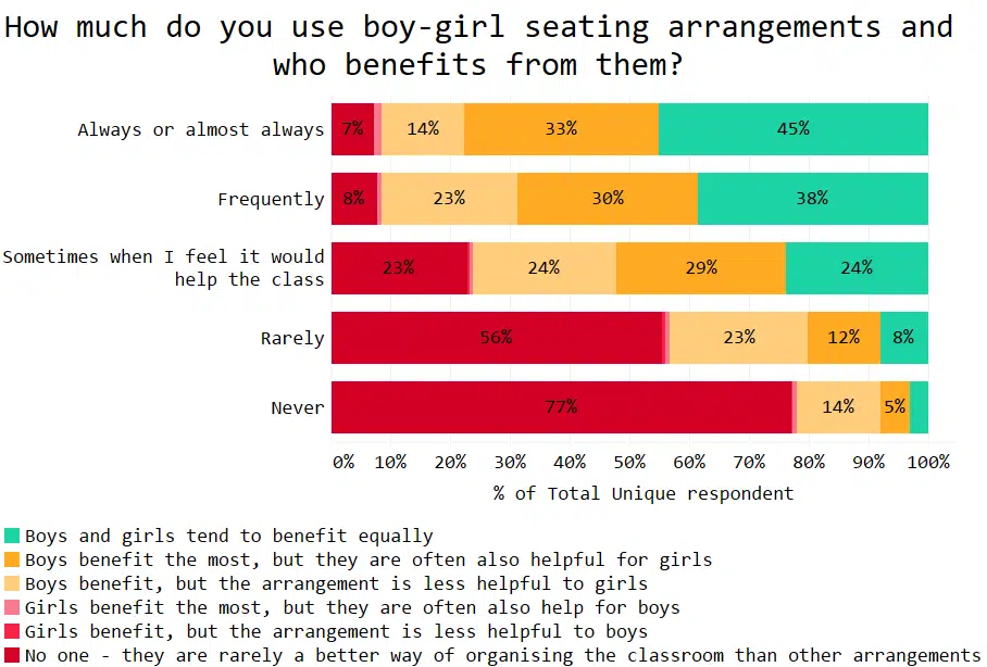 Then there’s the group who think boys benefit but that’s it also helpful for girls – AND YET they never use a gendered seating plan. This group is represented in bright orange. If you look, 5% of teachers who never use a gendered seating plan still think it’s good for boys and can also be helpful to girls. Boggling.