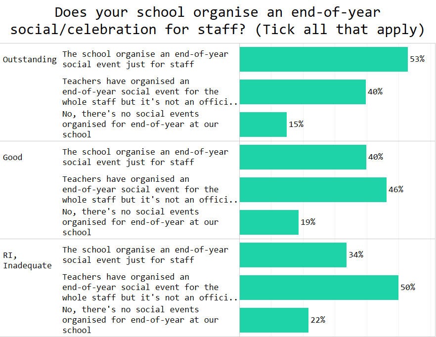 Outstanding schools tend to organise end-of-year events for their staff, whereas those rated requires improvement & inadequate tend not to. Boo! Never fear, however, it seems the staff in those schools take it upon themselves to organise something anyway. You total troopers: we applaud you ???.