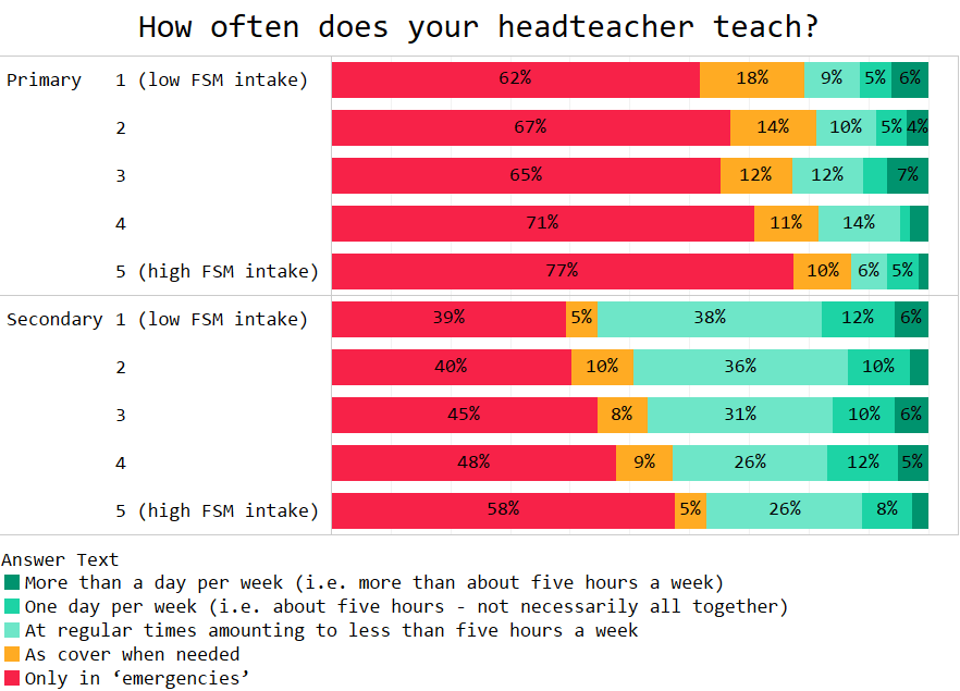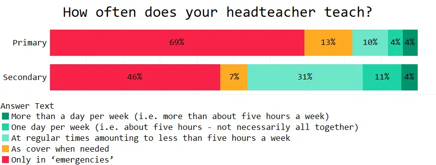 The thing that surprises everyone is that secondary headteachers appear to teach more than primary ones. Perceived wisdom is that primary heads do more, but this may be because of the way an emergency cover for a primary teacher could mean covering someone for a whole day, whereas secondary it tends to only be individual lessons.