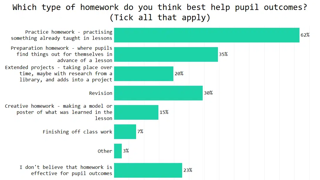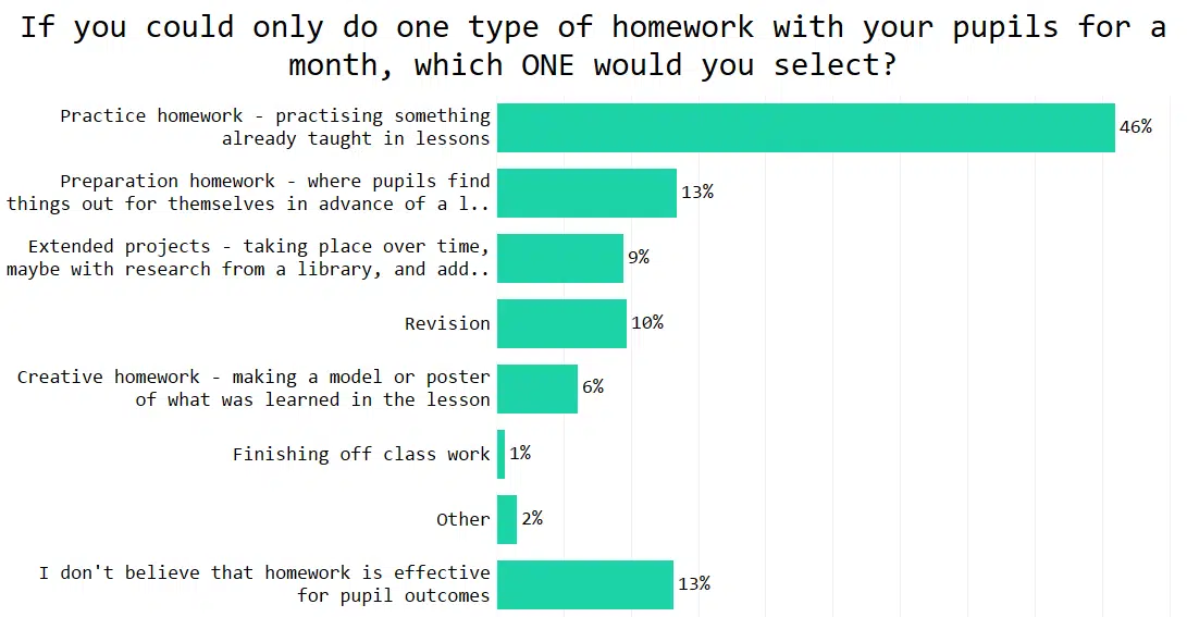 Practising something already taught in class seems to be the most popular homework type – although, if they could only choose one for the next month, 9% of teachers said they would pick extended projects and 6% picked creative activities such as modelling or poster creation.