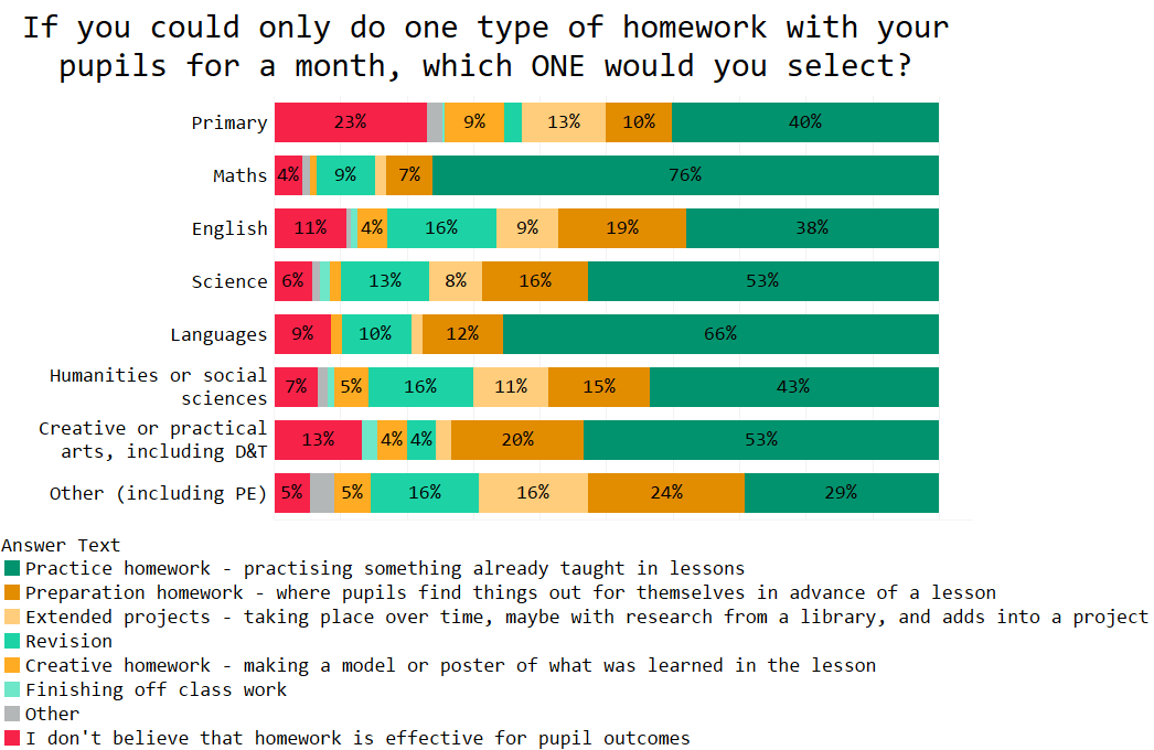 Practice varied enormously as a favoured homework type – with a substantial majority (76%) of maths teachers in favour of it, but just over a third of English teachers in favour (35%).