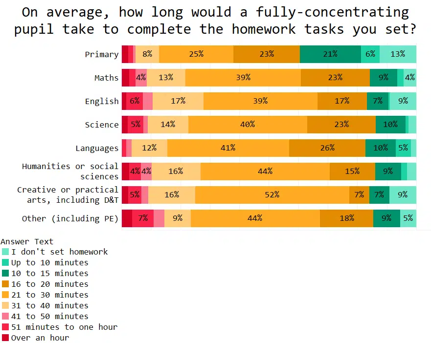 What we do know is that when it comes to time spent on homework, there is some variation between subjects and phase. Are you unusual among your teaching peers?