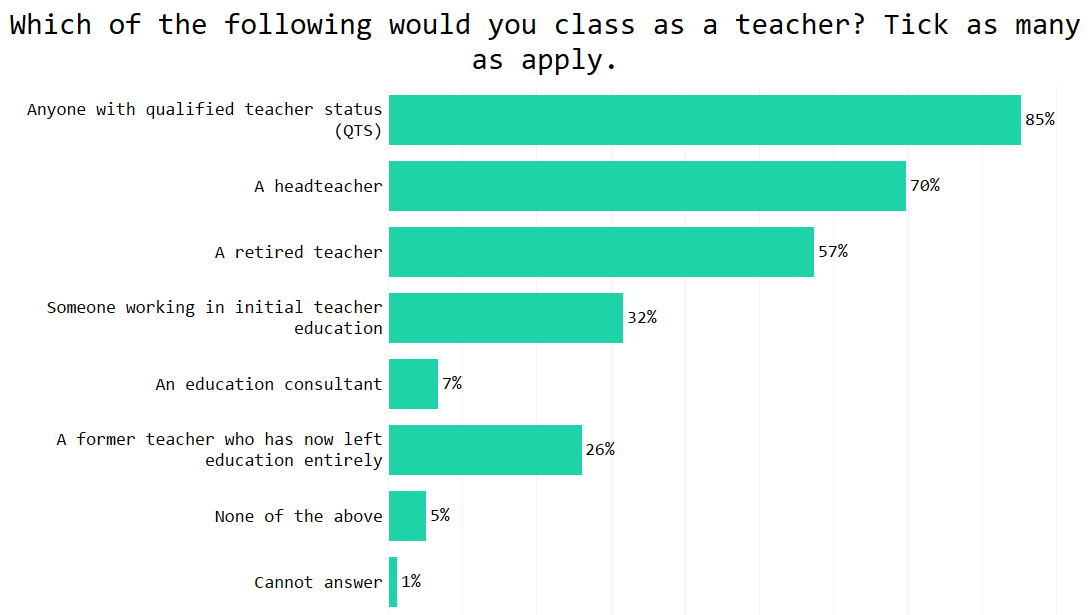 The most popular answer was that anyone with Qualified Teacher Status counts as a teacher. And yet, several of the categories with fewer people agreeing to them would also have people with QTS in them. Most headteachers will have QTS. As will retired teachers. As will former teachers.