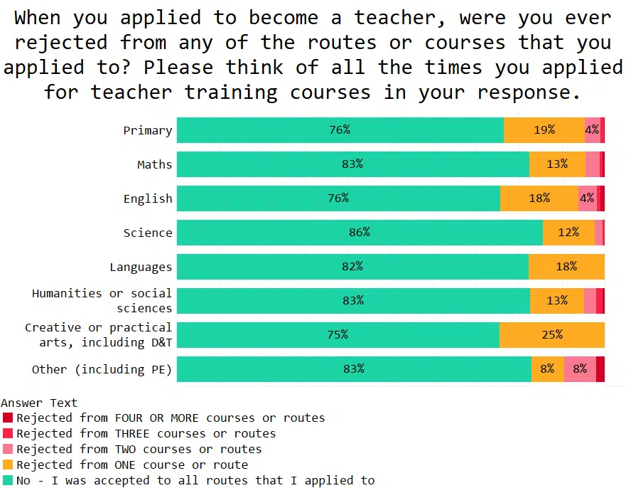 Rejections seem less frequent in the shortage subjects of maths and science – although it could be that people with those subjects are more easily put off, and so don’t apply again or elsewhere.