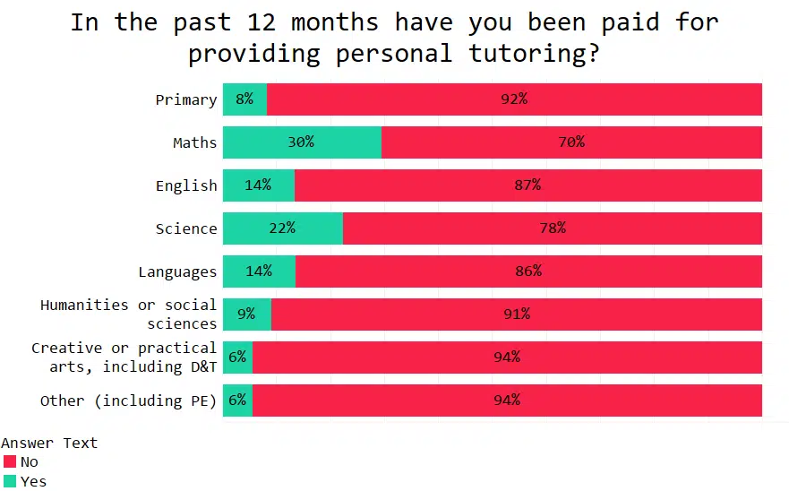 If we’re struggling as a country to get maths teachers, then one of their secret perks is they earn money via private personal tutoring. Three in 10 maths teachers said they were paid for personal tutoring outside of school in the past 12 months.