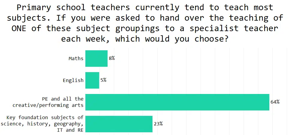 If primary teachers could hand over one subject grouping to a specialist teacher, they actually selected PE and all the creative/performing arts. The very subjects people say makes primary teaching worthwhile! And maths & English were the ones teachers most wanted to keep.