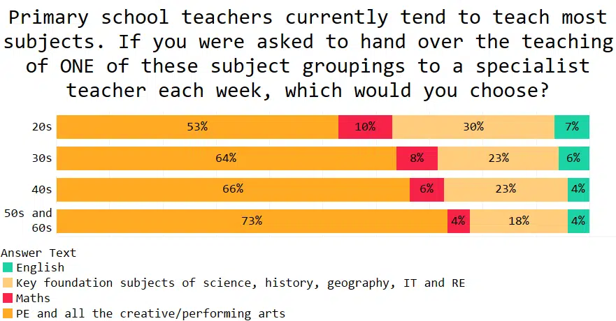 There is a slight age effect. Younger teachers were slightly more inclined to give up foundation subjects, maths, and English, compared to their older peers. But in every group PE/creative arts dominated.