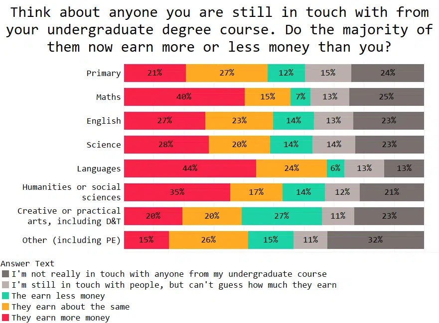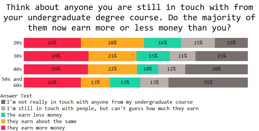 BUT note something odd… As we get older, the percentage of people who are not in touch with people from their undergraduate course grows. This makes sense. We lose contact as lives wear on. BUT, regardless of age, around 26-29% of the cohort reckoned the majority earned more. This percentage doesn’t appear to change regardless that more teachers said they had now lost contact, meaning we’d expect the numbers across all earnings groups to have reduced accordingly.