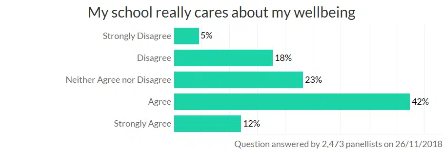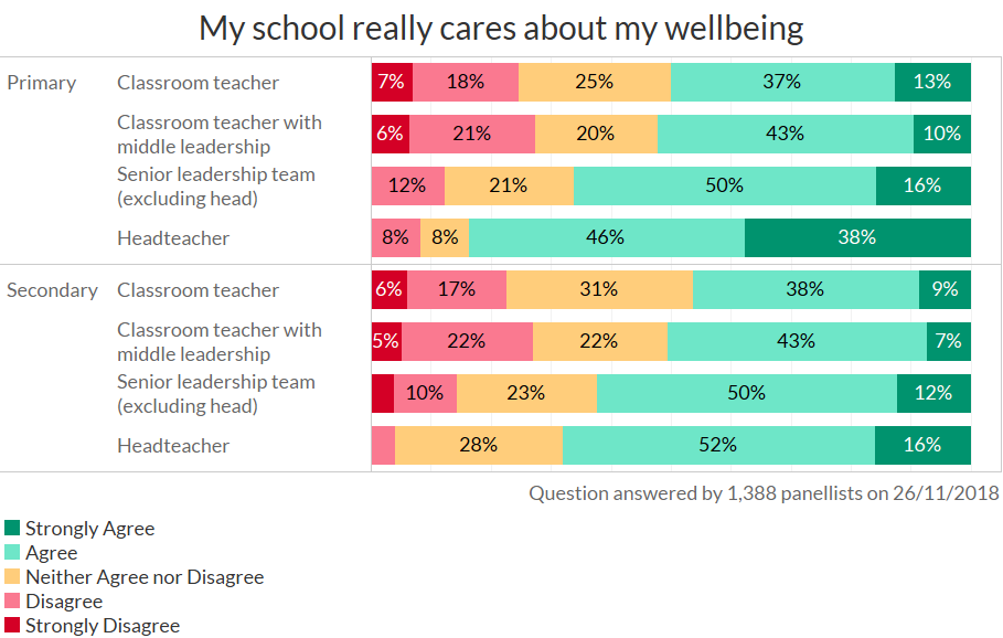 54% of teachers think their school really cares about their wellbeing. Which leaves an alarming 46% who feel their school is indifferent or directly does not care.