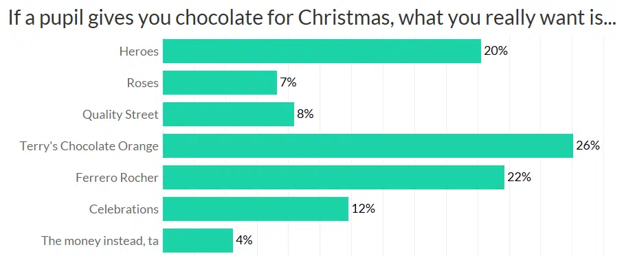 Maybe it’s the small packaging, maybe it’s the satisfying way that clonking it on a table breaks it open, but it turns out that, when all is said and done, what teachers really want for Christmas is a Terry’s Chocolate Orange. Or, failing that, some Ferrero Rocher.