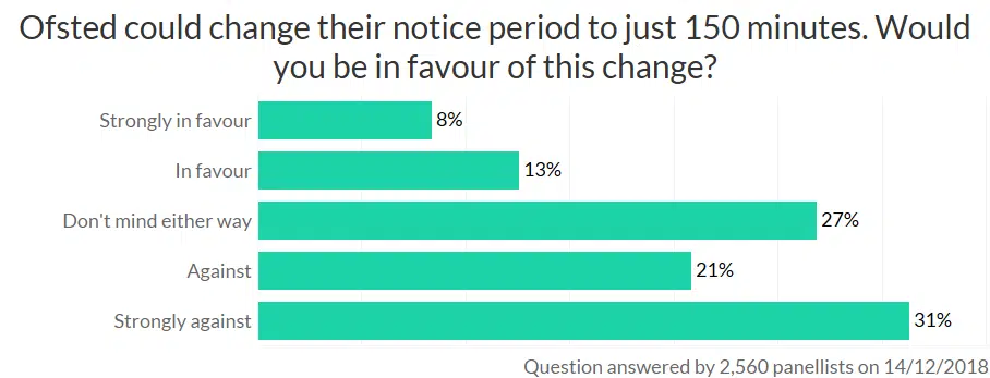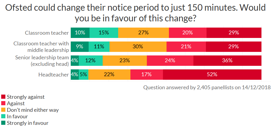 Senior leaders dislike the 150-minutes notice most of all (52% heads were strongly against), which isn’t surprising given they put the paperwork together ready for Ofsted’s arrival. If a head is out of school when the call comes in, it will put the other leaders in a difficult position. Other panelists said it also increases the stress on staff.