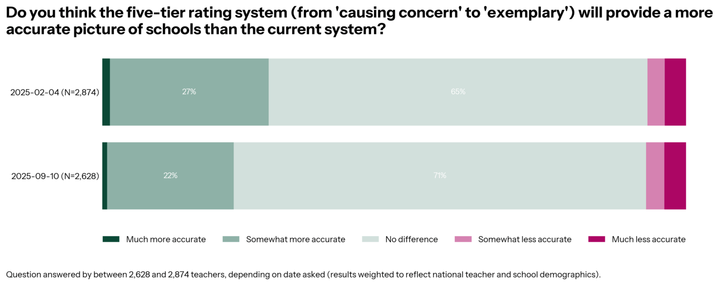 Most teachers don’t think so. The majority said the new five-tier system will make “no difference” to the accuracy of inspections. And not only that, but confidence in the reforms bringing change seems to have been chipped away since we asked earlier this year.