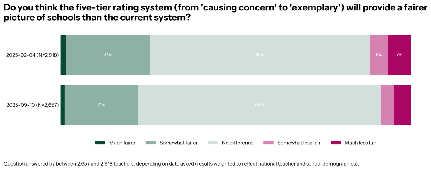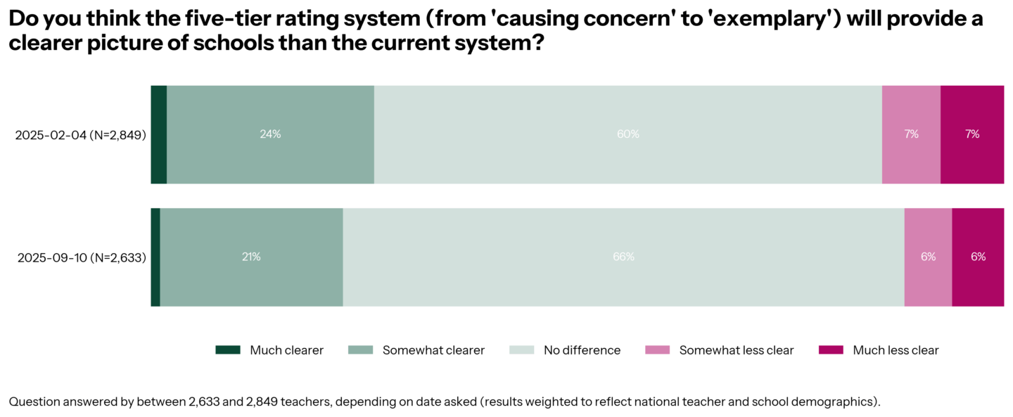 The number of teachers thinking the change would make “no difference” to providing a fairer picture of schools grew from 63% to 69%. The number who believe the change will make “no difference” to portraying a clearer picture of schools increased from 60% to 66%, and finally, the number who think the change will make “no difference” when providing an accurate picture of schools inched up from 65% to 71%.