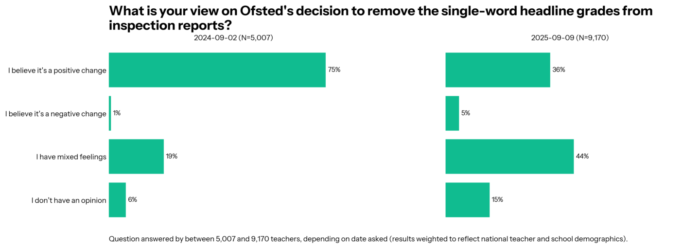 This time last year, Teacher Tappers felt more positive about the decision to remove single-word headline grades. However, after 12 months of the change being implemented, and a new plan on the table, that support has dropped from 75% to 36%, and the number of teachers who now have mixed feelings has increased from 19% to 44%.