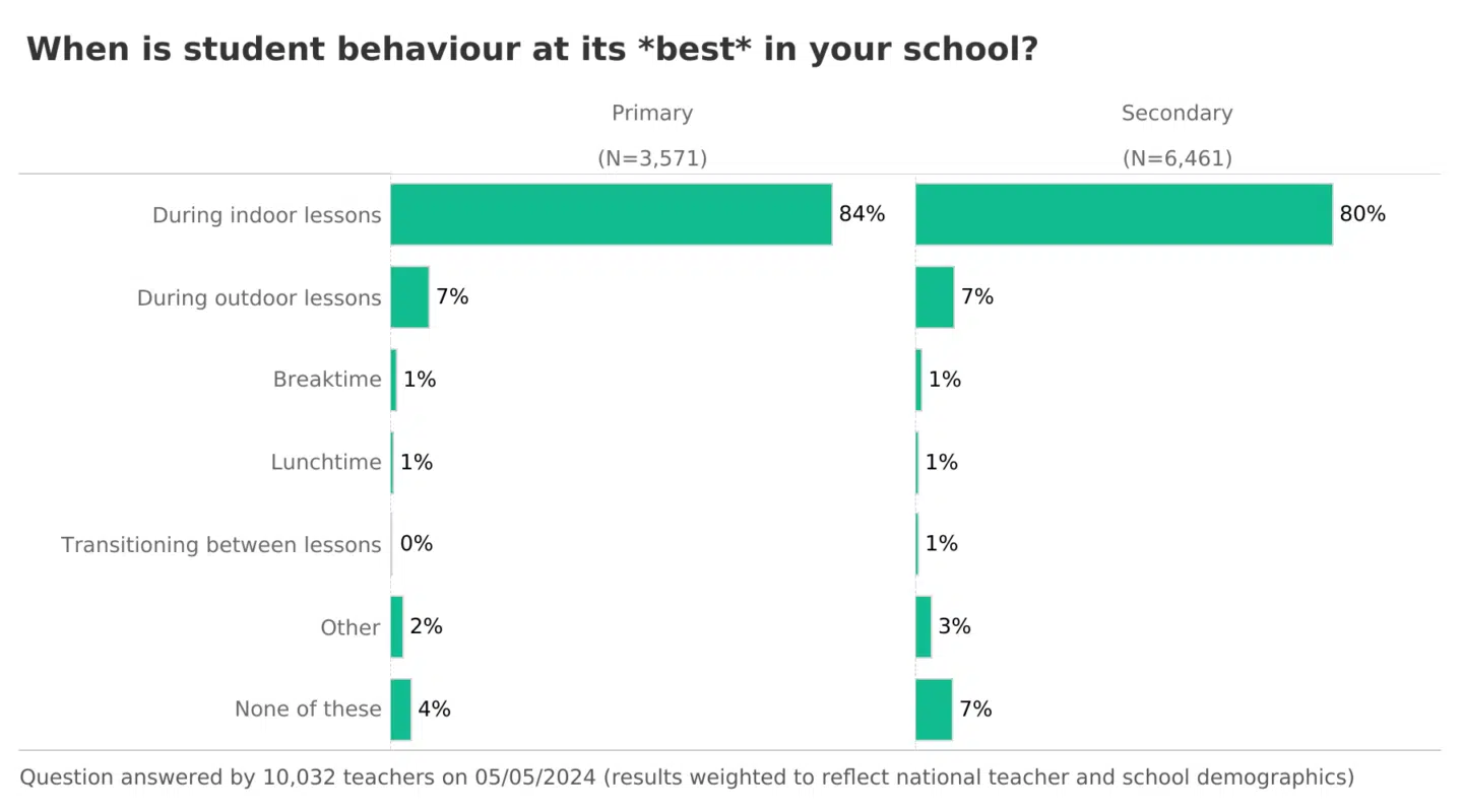 It’s also interesting to note ‘none of these’ was given by 4% of primary school teachers, compared to 7% of secondary 🤔. Is that student behaviour is bad everywhere here? Or somewhere else?! Read on to find out…