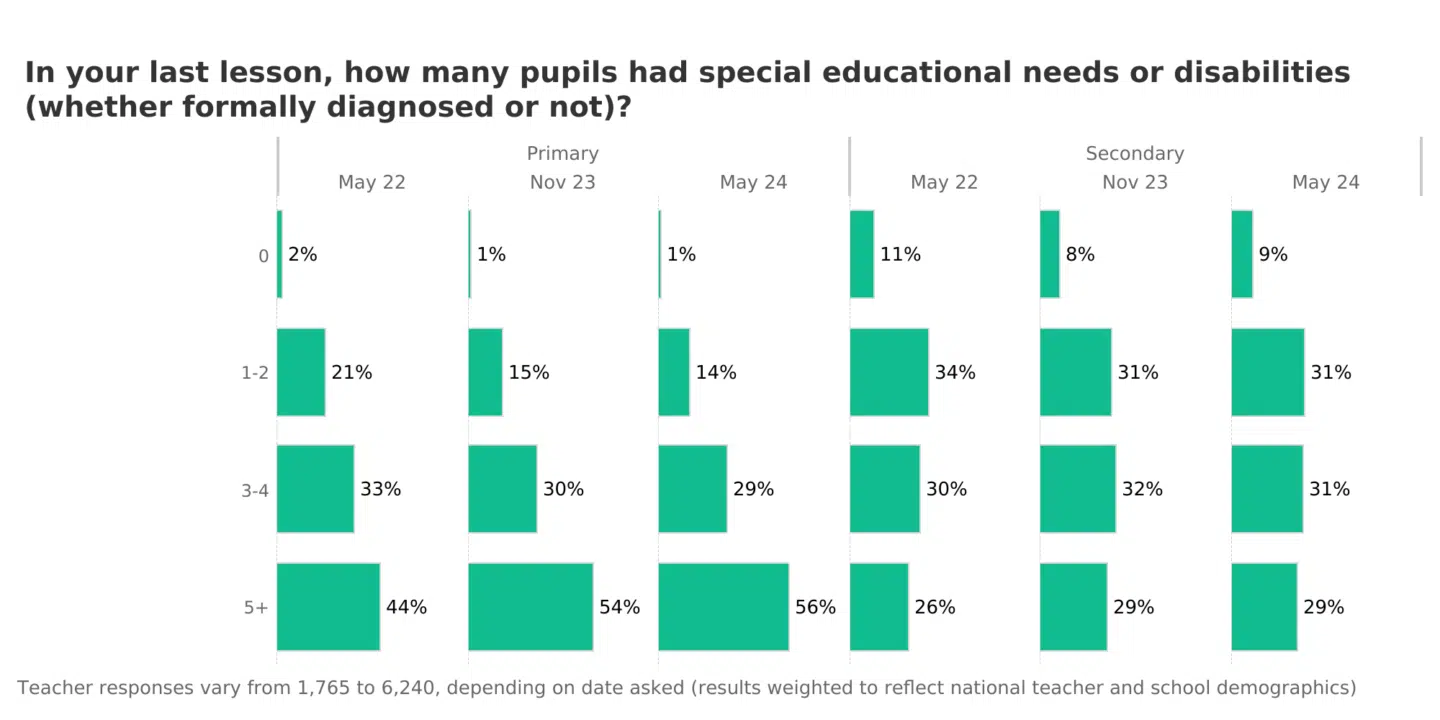 When looking just at primary, there are far more teachers in KS2 classrooms saying you had 5+ SEND pupils compared to those in EYFS and KS1 (49% vs 59%). And this makes sense – many children aren’t diagnosed before KS2.