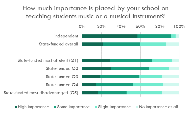 Whilst almost all of you agree that music education is important, there is now considerable divergence in whether you feel music is valued at your own school. In the independent sector, 92 per cent of teachers agree that music teaching is of some or high importance in their school. In state-funded schools serving the most affluent communities in England this figure is 72 per cent. By contrast, only 45 per cent of teachers who work in state schools serving the most disadvantaged communities agree that music is treated as important in their school.