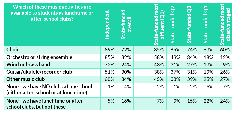 Independent schools and state-funded schools serving more affluent students have a wide range of musical activities available to students in lunchtime or after-school. By contrast, almost one-third of schools that serve our most disadvantaged communities have NO musical clubs available to students.