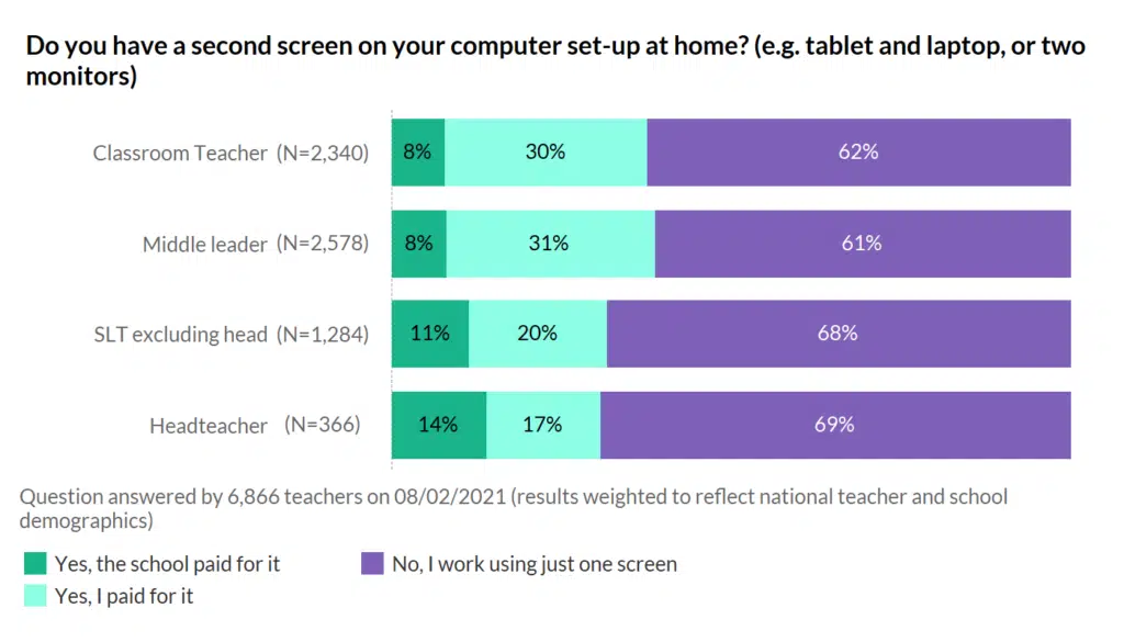 Second screens are a popular item for teachers to have bought themselves, with nearly 1-in-3 classroom teachers providing their own second device. In some cases this will be an already-owned phone or laptop, but kudos to the teacher who sent a photograph of their gamer screen set-up looked like a 180-degree iMax experience!